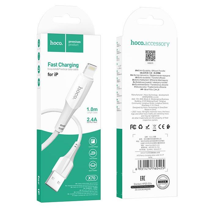 HOCO Ferry X70 cable with USB-A – Lightning connector. Supports charging and data transmission. Bending resistant, strong nylon braid, reinforced structure. Compatible with Apple devices.